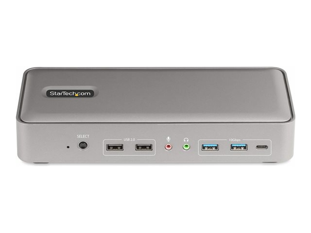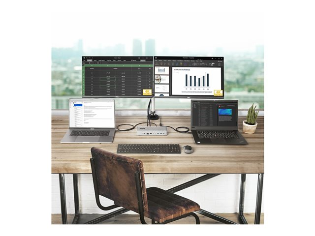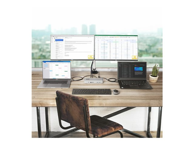 Dock et basculez entre deux ordinateurs portables pour accéder à vos périphériques de poste de travail, y compris deux moniteurs, en passant sans problème d'un ordinateur portable à l'autre d'une simple pression sur un bouton. Le logiciel téléchargeable Hot-Key (disponible pour Windows et macOS) permet aux utilisateurs de basculer entre les ordinateurs à l'aide de combinaisons de touches depuis un clavier.