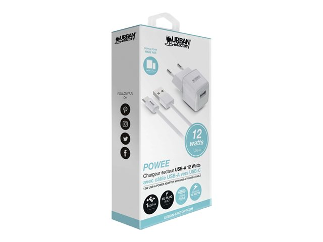 Le chargeur secteur POWEE possède une sortie USB-A de 12 W qui vous permettra de charger aussi bien votre tablette que votre téléphone en un temps record. Son design est compact et la prise USB centrale vous permettra de brancher et débrancher votre câble très facilement. Le chargeur est accompagné d'un câble USB-A vers USB-C.