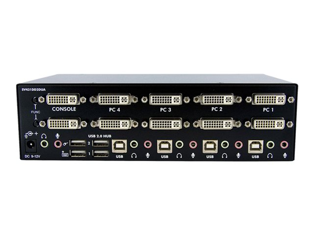 Le commutateur KVM USB double DVI à 4 ports SV431DD2DUA permet le partage entre quatre PC dotés de sorties vidéo double DVI, et deux moniteurs, un microphone et un ensemble de haut-parleurs, un clavier et une souris ainsi que deux autres périphériques USB.